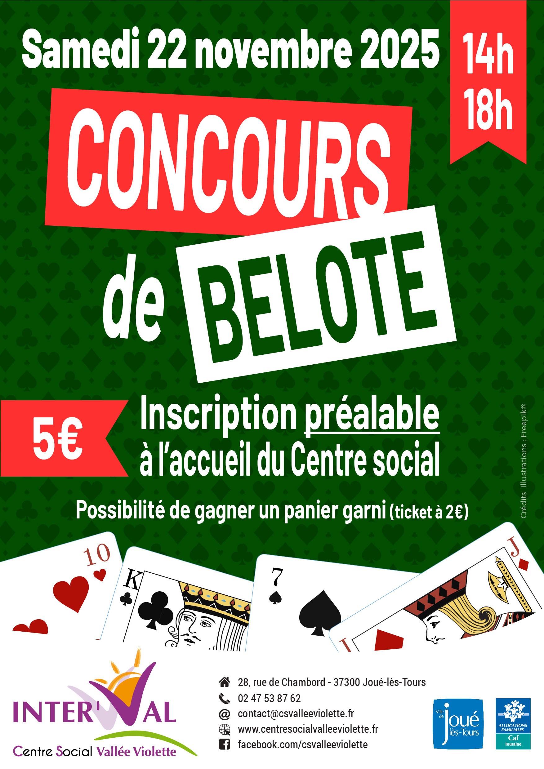 Le Centre social Inter’Val organise un concours de belote le samedi 22 novembre 2025 de 14h00 à 18h00.