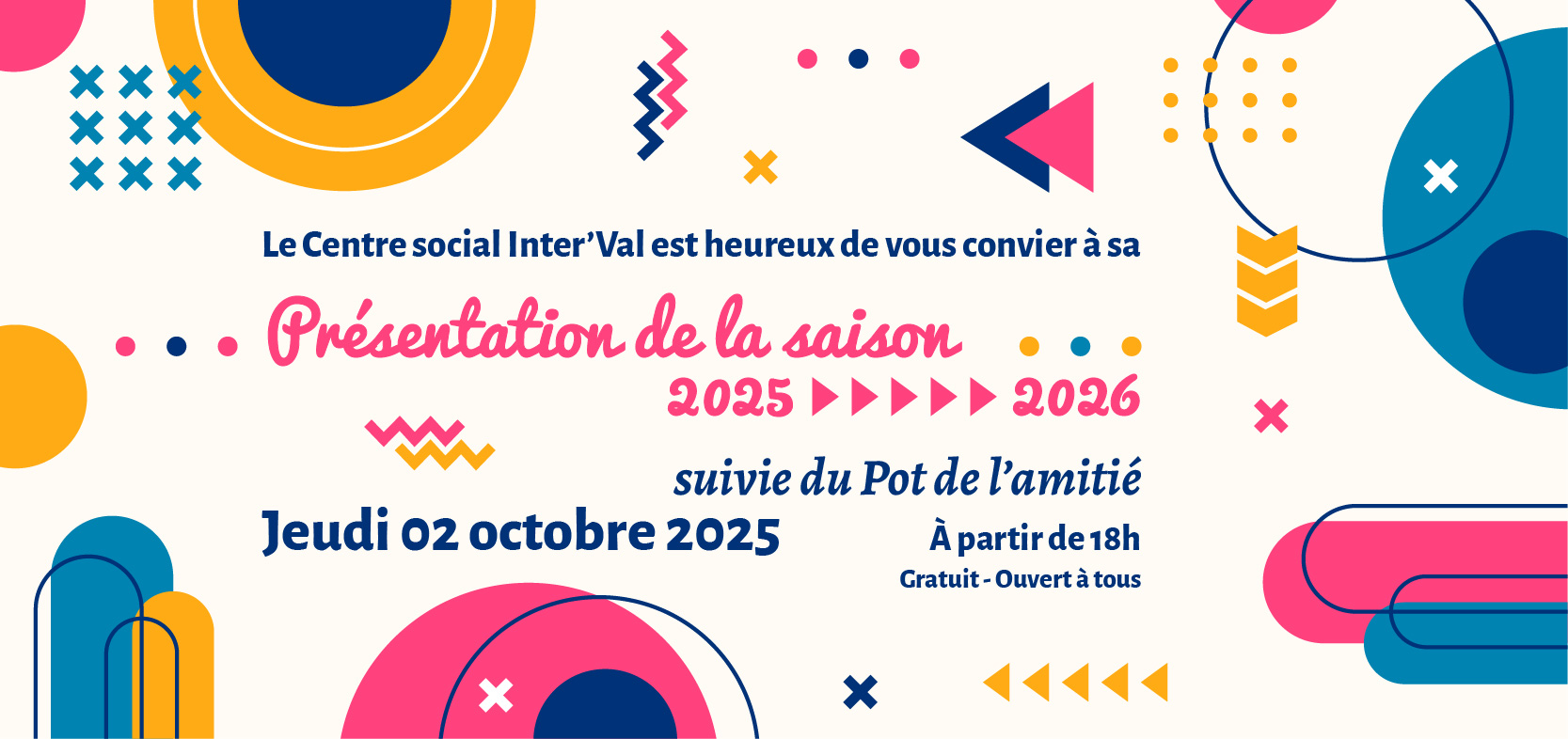 Le Centre social est heureux de vous convier à son pot de lancement de la saison 2025-2026 le jeudi 2 octobre à 18h.